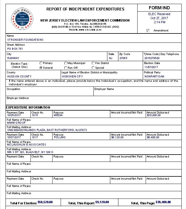 A copy of the Stronger Foundations official campaign finance report now shows $50,000 spent on the Hoboken election.